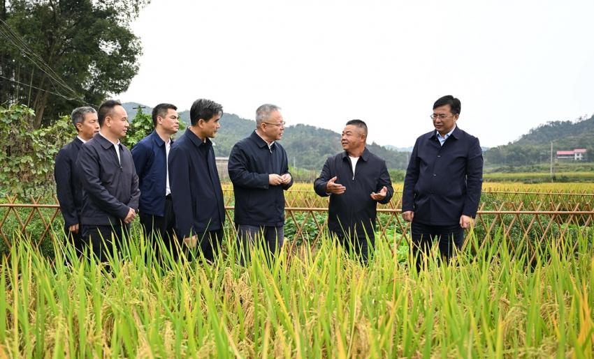 (10月9日,沈曉明在婁星區(qū)水洞底鎮(zhèn)鎘低積累水稻品種示范基地察看水稻長勢。)